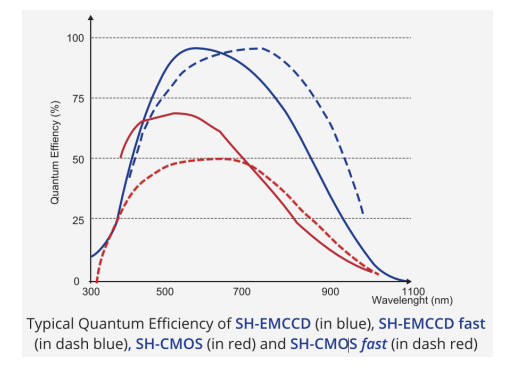上图表示SH-EMCCD(蓝色实线),SH-EMCCD-fast(蓝色虚线),SH-CMOS(红色实线)SH-CMOS-fast(红色虚线)的典型量子效率。横轴为波长(单位nm),纵轴为量子效率(单位%)。