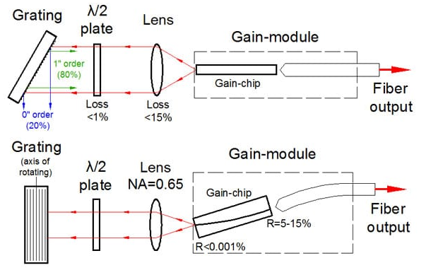 该设备包括带有弯曲条纹的“C型”增益芯片。条纹倾斜的刻面专为外部反馈而设计,并具备深层AR涂层,从而使芯片波导的背反射极低。具有垂直条纹的刻面具有适当的反射率(通常在5-15%的范围内),同时提供宽波长调谐和高输出功率。标准器件中这一方面的反射针对在外腔设置中的操作进行了优化,该设置为芯片提供了有效的反馈(约 50%)。对于反馈较低的方案,我们建议使用在刻面上具有不同涂层的定制设备,以提供优化的反射。德国Innolume增益管子的调谐范围:100-160 nm,输出功率:300 mW。