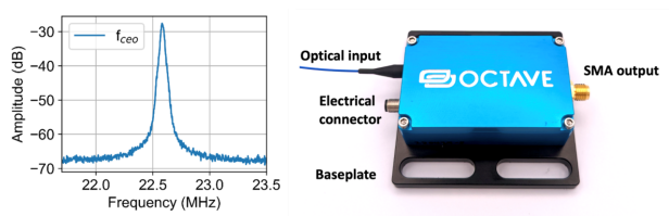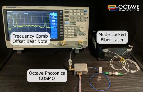 Octave Photonics的光频梳偏频测量模块(COSMO),为测量载波包络偏移频率(fceo)的f-2f自参考锁定过程提供了一种紧凑且方便的解决方案。COSMO运用了非线性波导技术产生超连续谱,将频谱扩展到至少一个倍频区域,通过低频翻倍与高频进行重叠,从而精准测定fceo。同时,COSMO可以用极低的脉冲能量检测目标频率,从而实现更低的功耗或更高的重复频率。